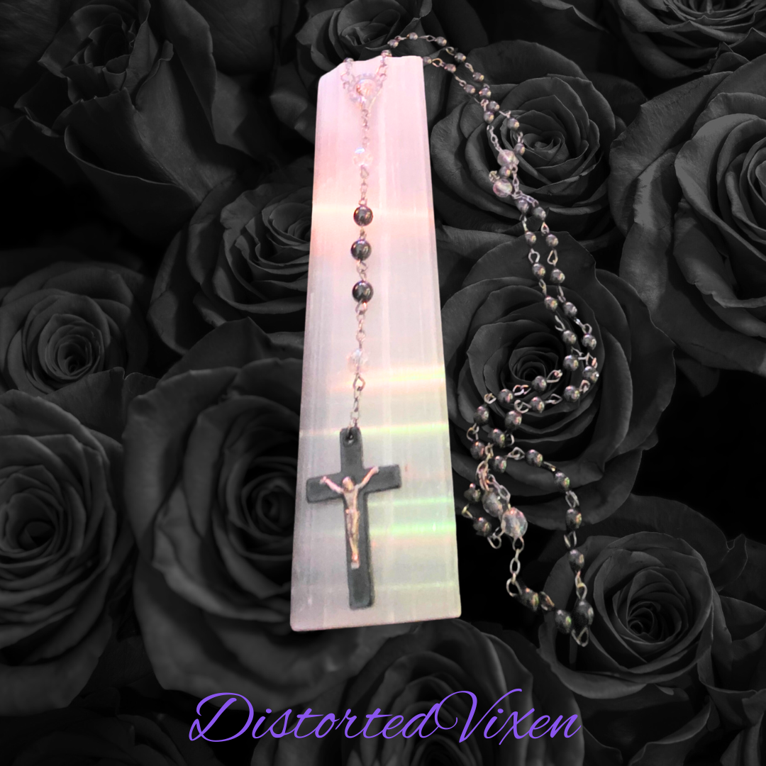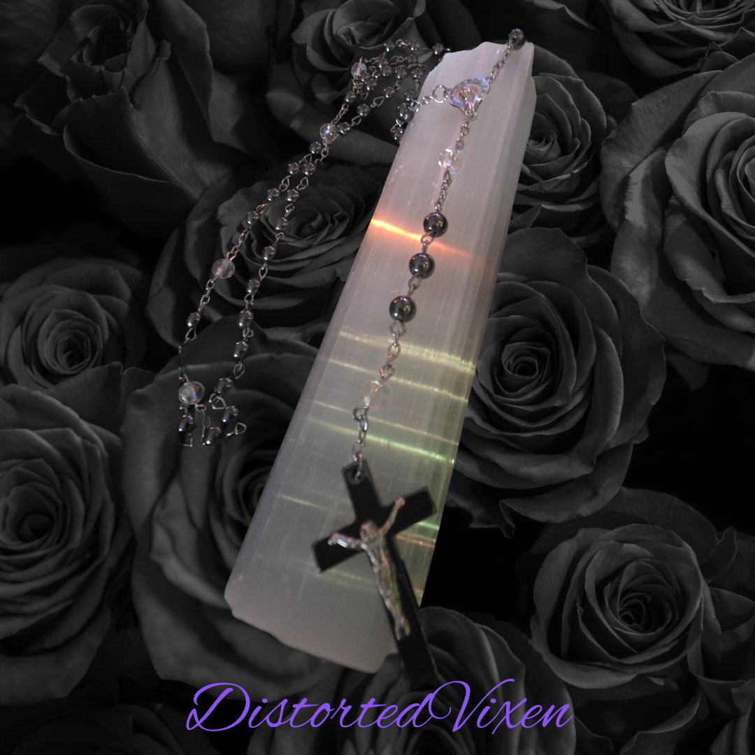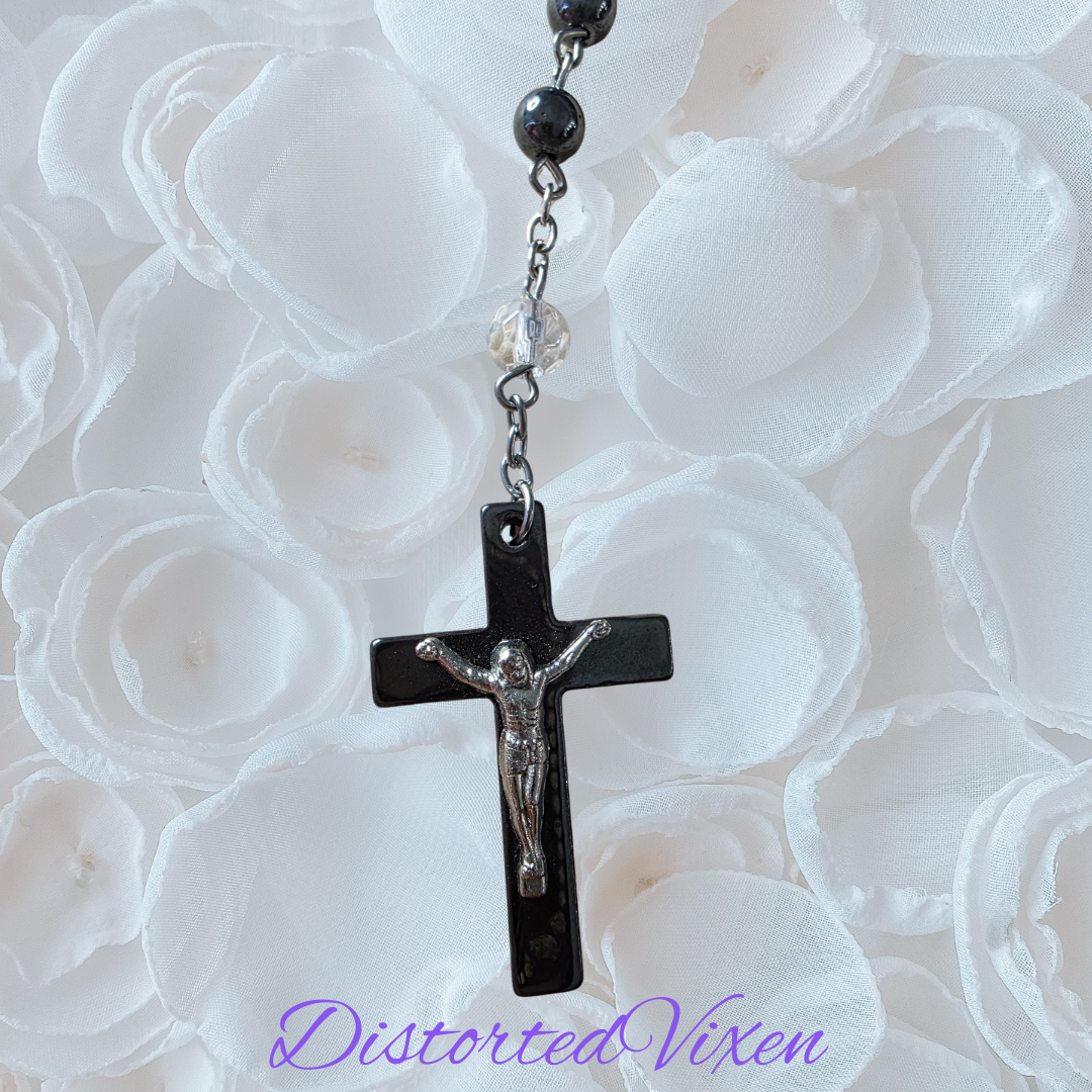 A handcrafted rosary made with deep black hematite beads and sparkling crystal accents, blending sacred symbolism with a bold, gothic edge. This piece follows the traditional rosary layout with a black crucifix pendant, giving it spiritual meaning and eye-catching style.