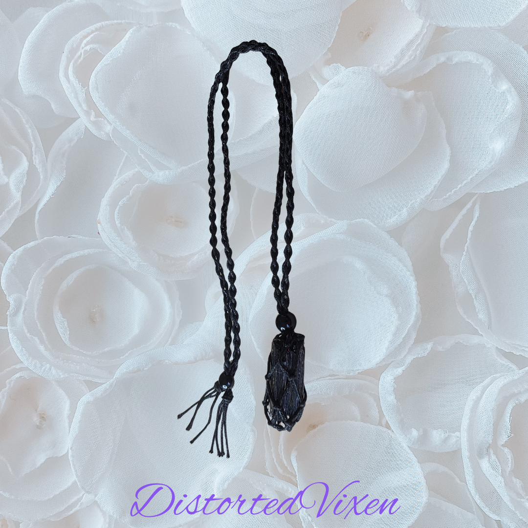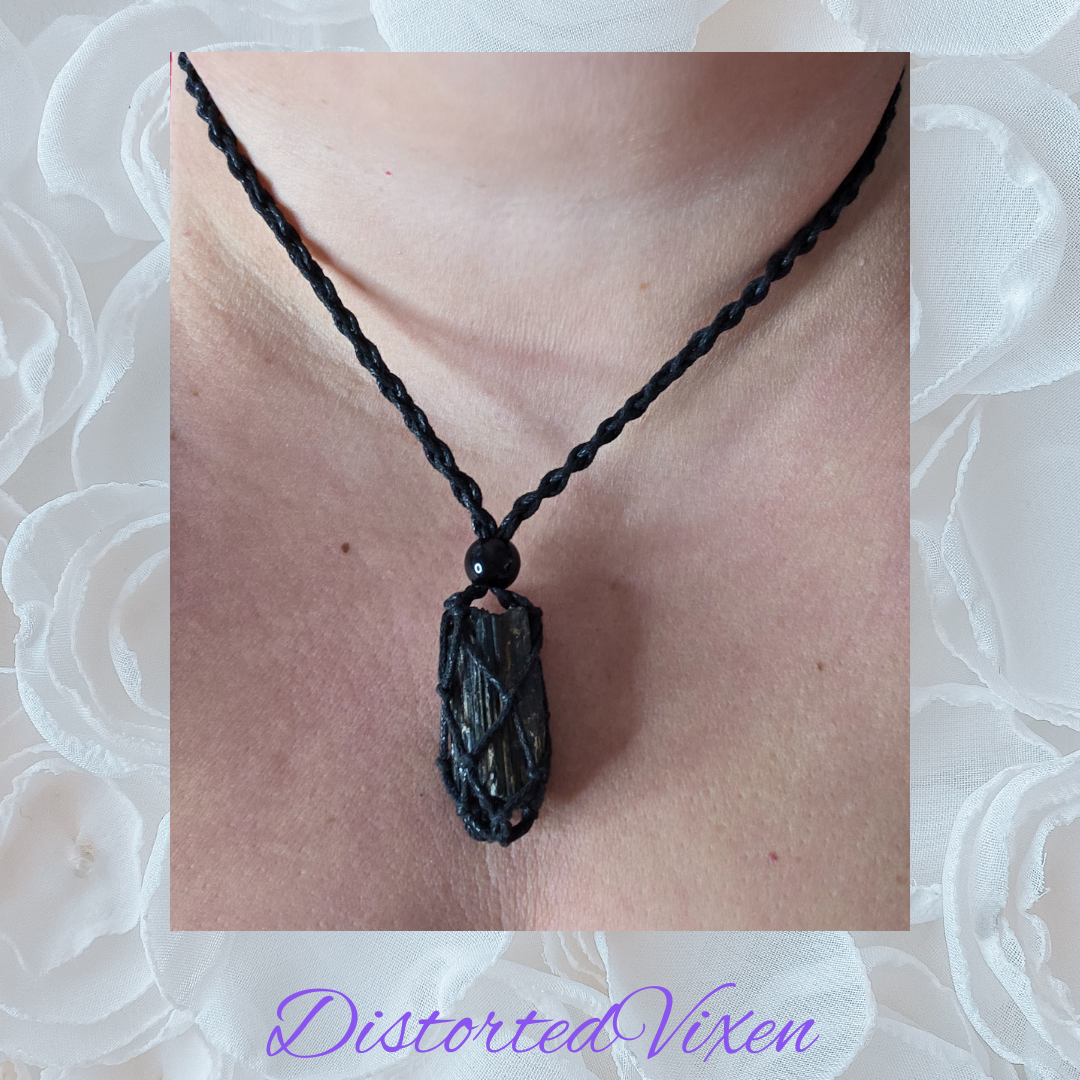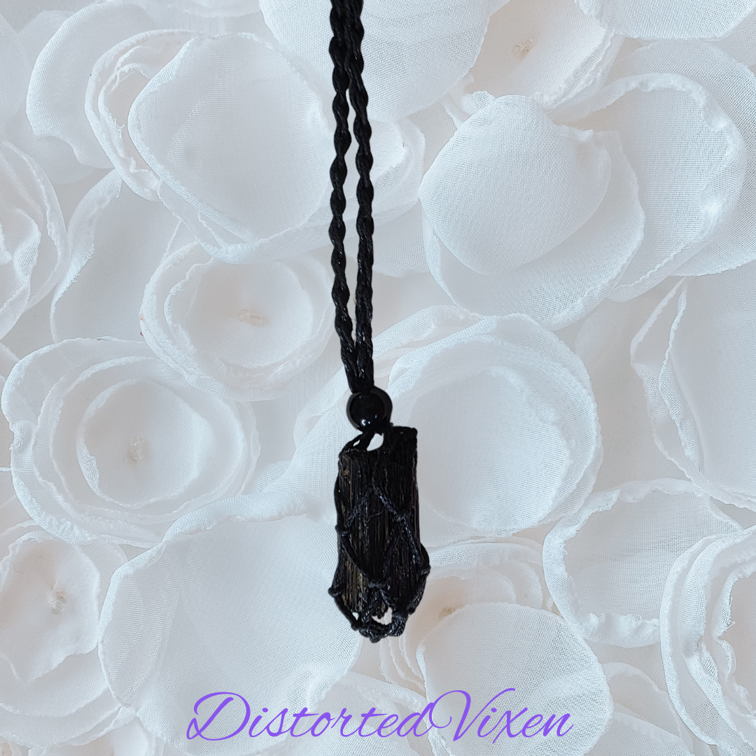 This black tourmaline macramé necklace features a raw, natural tourmaline crystal wrapped securely in black cord using intentional knotwork and an adjustable sliding closure.