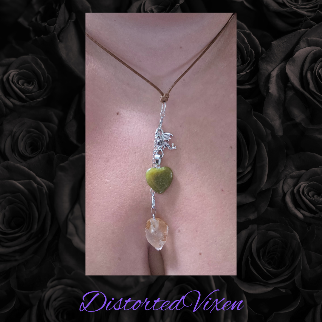 Made to evolve as you do โ this adjustable necklace from Distorted Vixen features a polished green aventurine heart, a raw citrine crystal, and my signature silver dragon charm.