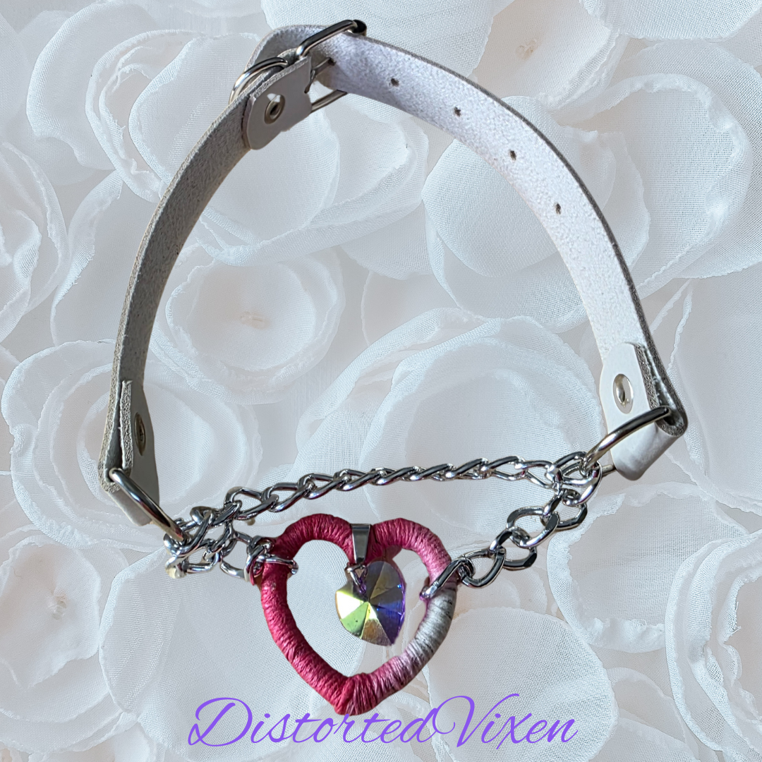 Pink & White Heart Choker – Wrapped Fiber Heart with Crystal Charm – Adjustable Chain Choker – Soft Grunge / Alt Jewelry