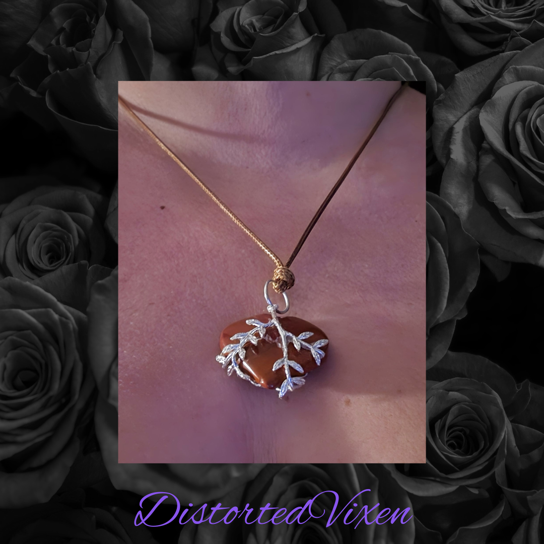 A warm, earthy Red Jasper heart wrapped in a delicate silver vine — a piece that feels like a little ember of courage resting at your collarbone.