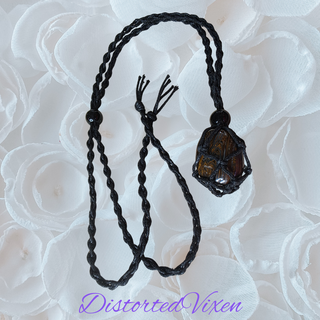 Each piece in this listing is hand-knotted in black cord and wrapped intuitively around genuine Tiger’s Eye, allowing the stone’s natural banding and depth to remain fully visible. No two are alike — each holds its own pattern, weight, and presence.